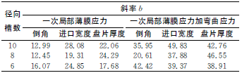 通過最小二乘法對(duì)各曲線進(jìn)行線性擬合,獲得各擬合曲線的斜率b值,即可比較各參數(shù)在各自變化范圍內(nèi)對(duì)應(yīng)力的影響程度,見表4。由表4可知,在各參數(shù)給定范圍內(nèi),倒角對(duì)應(yīng)力的影響最小,而盤片厚度和進(jìn)口寬度對(duì)應(yīng)力的影響較為接近。
