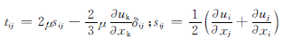 式中,tij、sij分別為牛頓流體中的應(yīng)力應(yīng)變關(guān)系和應(yīng)變率張量;p為介質(zhì)壓力;μ為介質(zhì)的動(dòng)力粘度;δij為克羅內(nèi)克符號(hào)。