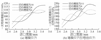 圖7 徑向槽數(shù)不同時(shí)進(jìn)口寬度對(duì)應(yīng)力的影響