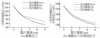 圖6 徑向槽數(shù)不同時(shí)盤片厚度對(duì)應(yīng)力的影響