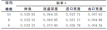 在盡量減小數(shù)值誤差影響的前提下,為比較各參數(shù)對(duì)流量的影響程度,采用最小二乘法對(duì)各曲線進(jìn)行線性擬合,得到各擬合曲線的斜率b值,見表2。通過比較斜率b值的大小,就可得出各參數(shù)在其變化范圍內(nèi)對(duì)流動(dòng)的影響程度。由表2可知,在各參數(shù)的變化范圍內(nèi),流道深度對(duì)流量的影響最大,進(jìn)口寬度和倒角次之,出口寬度最小。