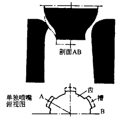 改進方法是在接觸環處噴嘴開始的地方加工出多條擴散狀凹槽,分別布置在噴嘴中,由相同尺寸的常規噴嘴分隔開,如圖3所示。這樣兩股汽流在交界面處發生強烈混合。由于粘性耗散的影響,如果激波發生,強度屬于中等。這種混合極其復雜,難以計算,但誘發的擾動消除了。