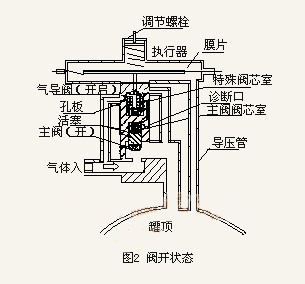 如圖1所示,當氮封閥關閉時,主閥的活塞是在一個密封室內,當儲罐壓力等于或大于設定的壓力時,膜片就被向上頂起,氣導閥在彈簧的作用下向上移動,把氣導閥上的密封圈緊緊壓在閥座上,關閉了控制氣的進口,同時特殊閥芯室的壓力增加并接近氮氣總管的壓力,此壓力通過內部通道,從特殊閥芯室傳到主閥閥芯室。主閥的活塞就處于氮氣總管壓力的作用,由于主閥閥芯上、下所受氣體壓力平衡,所以主閥閥芯在自重和彈簧的作用下將閥門緊密關死。