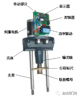 其電動執行器主要是由相互隔離的電氣部分和傳動部分組成,電機作為連接兩個隔離部分的中間部件。電機按控制要求輸出轉矩,通過多級正齒輪傳遞到梯形絲桿上,梯形絲桿通過螺紋變換轉矩為推力。因此梯形螺桿通過自鎖的輸出軸將直線行程傳遞到閥桿。執行機構輸出軸帶有一個防止傳動的止轉環,輸出軸的徑向鎖定裝置也可以做動位置指示器。輸出軸止動環上連有一個旗桿,旗桿隨輸出軸同步運行,通過與旗桿連接的齒條板將輸出軸位移轉換成電信號,提供給智能控制板作為比較信號和閥位反饋輸出。同時執行機構的行程也可由齒條板上的兩個主限位開關開限制,并由兩機械限位保護。