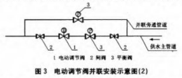 如圖2所示,將電動調節閥和平衡閥兩路并聯,聯合調節是目前常用的既經濟又合理且方便使用的組合方式。該方法的調節方法和過程是這樣的:在供熱初期,將平衡閥一路關閉,打開電動調節閥一路,根據實際需要調節開度,隨著供熱規模的擴大,調節電動閥的開度以適應用熱的發展,直至達到最大合理開度仍無法滿足要求時,先關閉電動調節閥,將平衡閥一路開啟,根據需要調節平衡閥的開度,由于平衡閥的調節功能有限,如果無法滿足流量要求或精度要求,此時開啟電動調節閥,對兩路流量進行合理分配和調節,即可達到需要的流量和精度要求。調節是個精細的工作,既需要操作人員的技術水平和經驗,又需要準確的供熱數據作為調節的基礎,因此要將此項工作做好,還需要做大量的準備和調節工作。