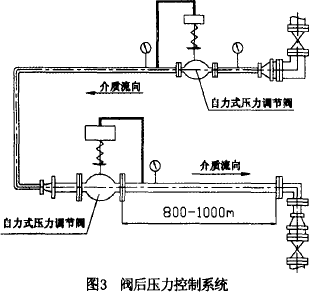 控制系統為穩定閥后壓力的系統,介質為氮氣,系統的初始管道壓力為2800KPa,后工段所需要的最大流量為2000NM3/h。工藝要求是后工段使用介質10分鐘后停止使用1小時,并按此方式循環使用;正常使用時閥后壓力穩定在700KPa,停止使用時閥后壓力不得高于800KPa。閥后輸送管道長度為800~1000米左右(如圖3所示)。